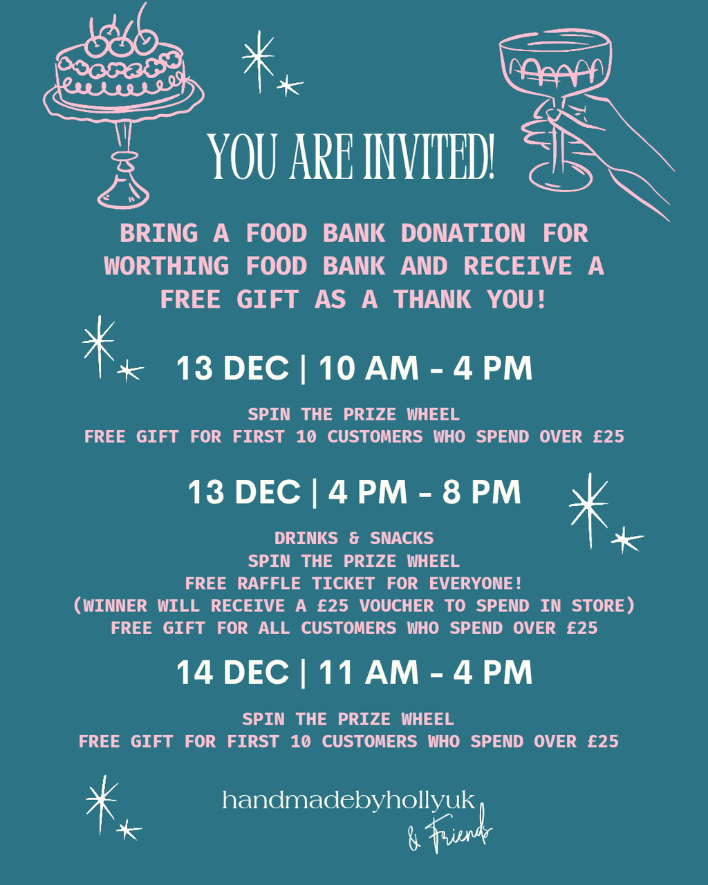 - Bring a food bank donation for Worthing Food Bank and receive a free gift from me as a thank you!🥫🎁 Times are tough and more and more people are turning to food banks so let's give what we can to those who need some extra help - there's a couple of lists of donation items they look to collect and one specifically aimed at items to include in their Christmas hampers, I will be posting these lists on my Instagram* & Facebook* closer to the time so you know what to bring🥫✨️ *(@handmadebyhollyukandfriends)