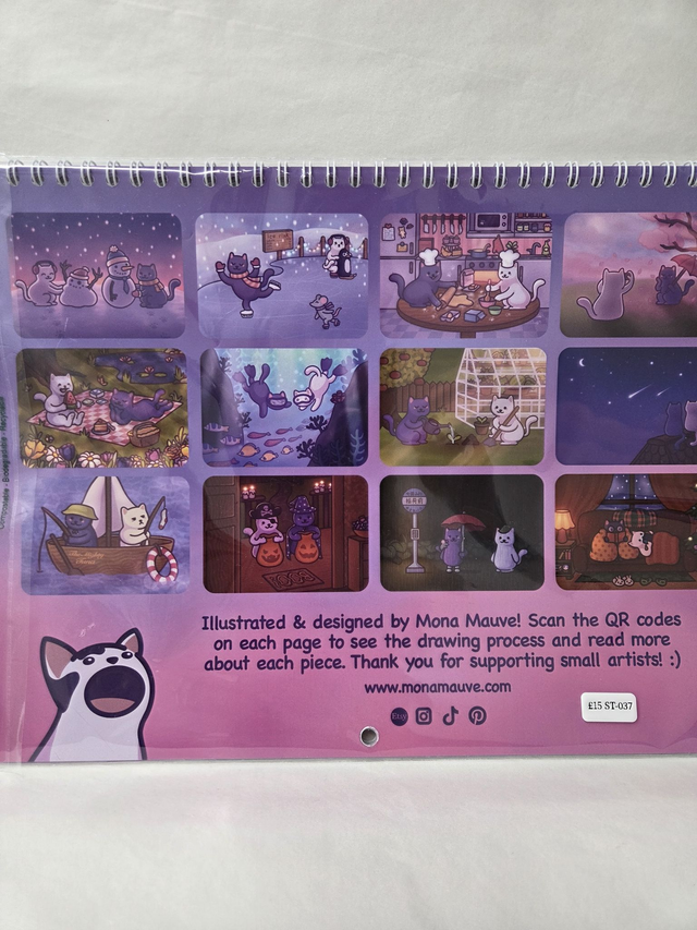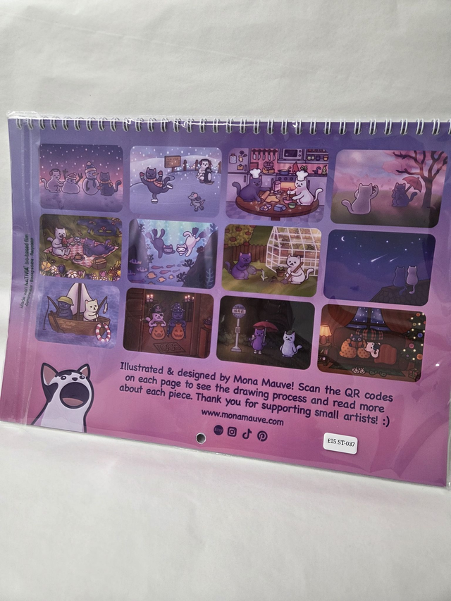 Scan the QR code on each calendar page to see the drawing process and read more about the making of each piece!