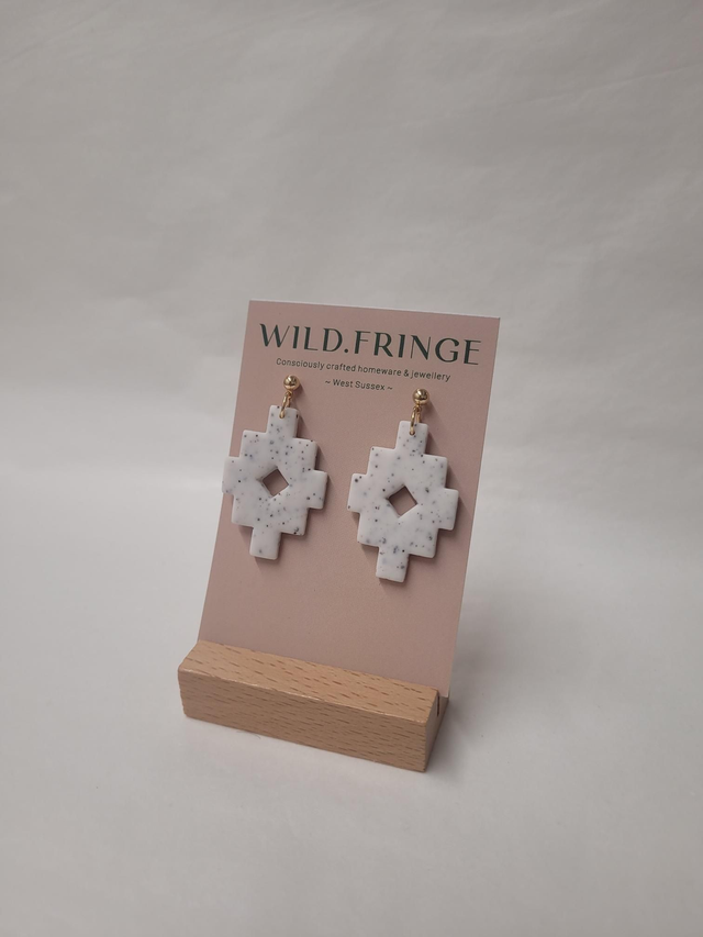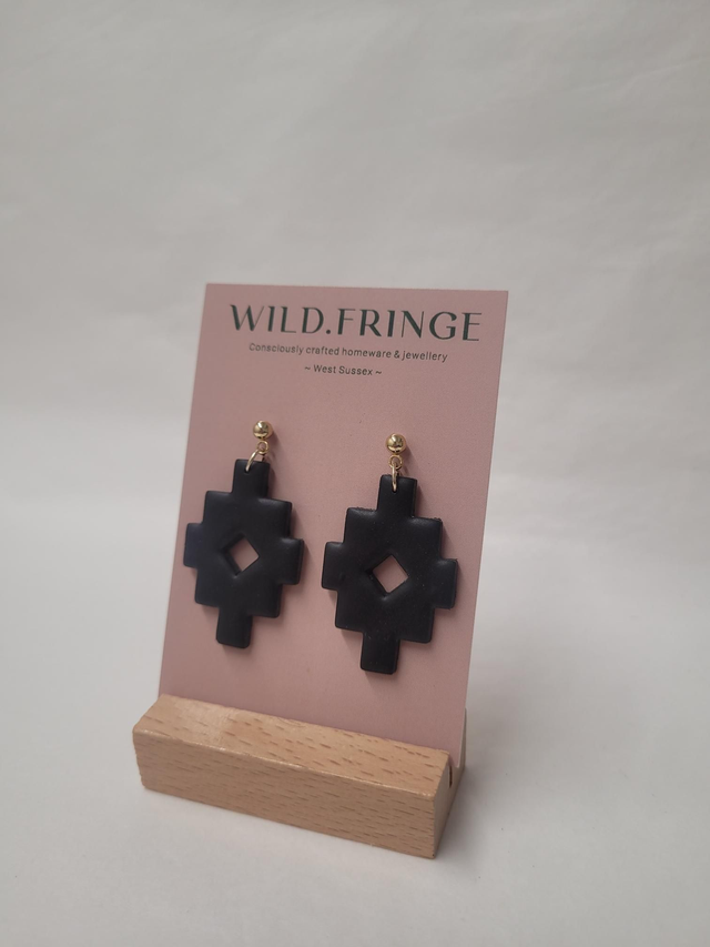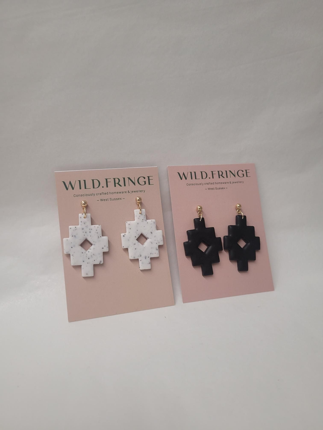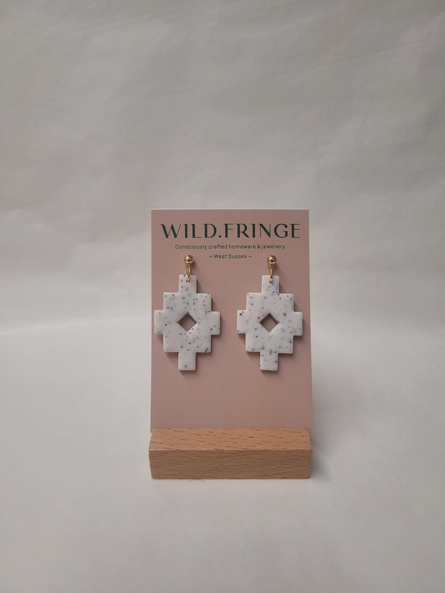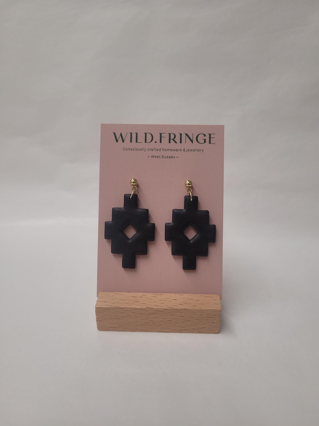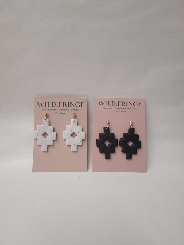 Polymer clay aztec shaped charm drop earrings. Featuring a 14K gold plated 4mm ball stud and butterfly backs.