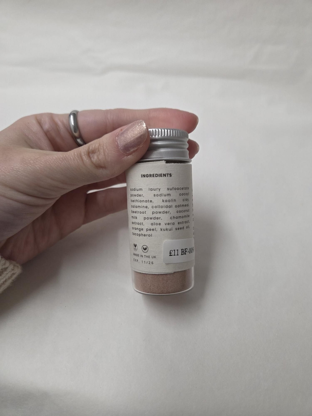 INGREDIENTS: Sodium laury sufoacetate powder, sodium cocoyllsethionate, kaolin clay, calamine, colloidal oatmeal, beetroot powder, coconut milk powder, chamomile extract, aloe vera extract, orange peel, kukul seed oil, tocopherol.