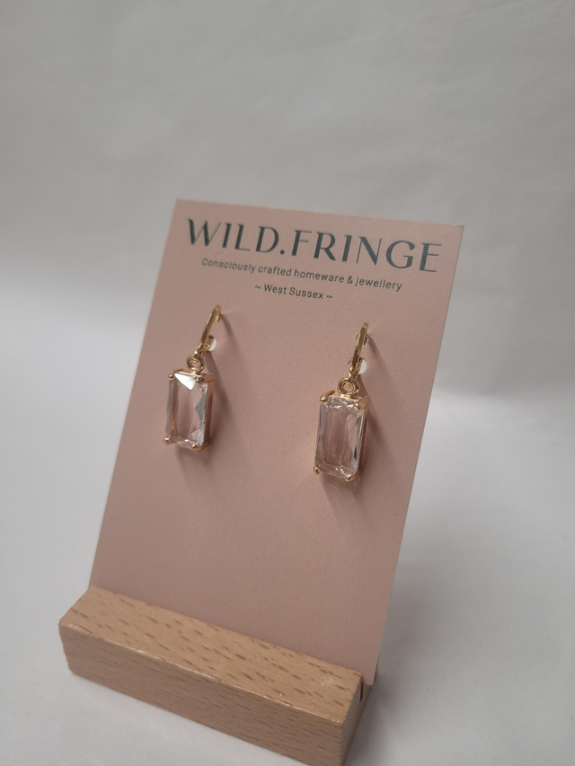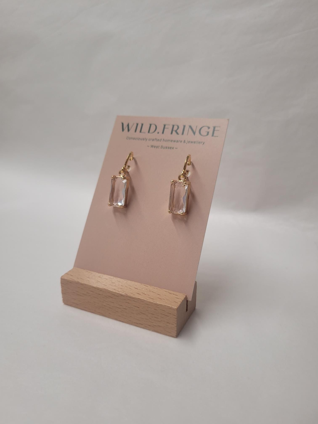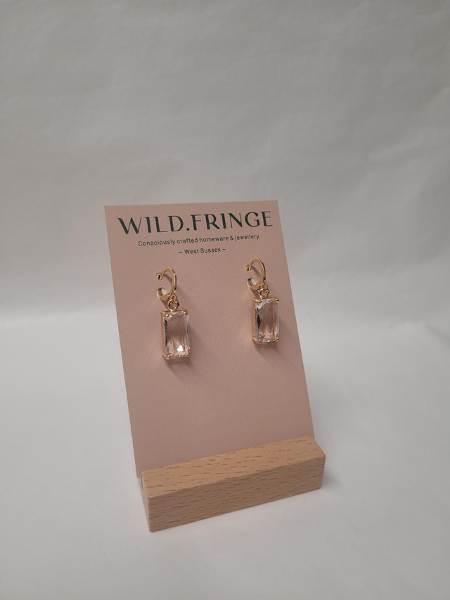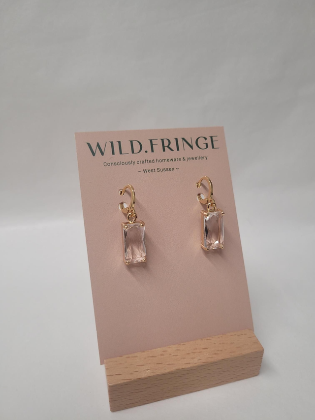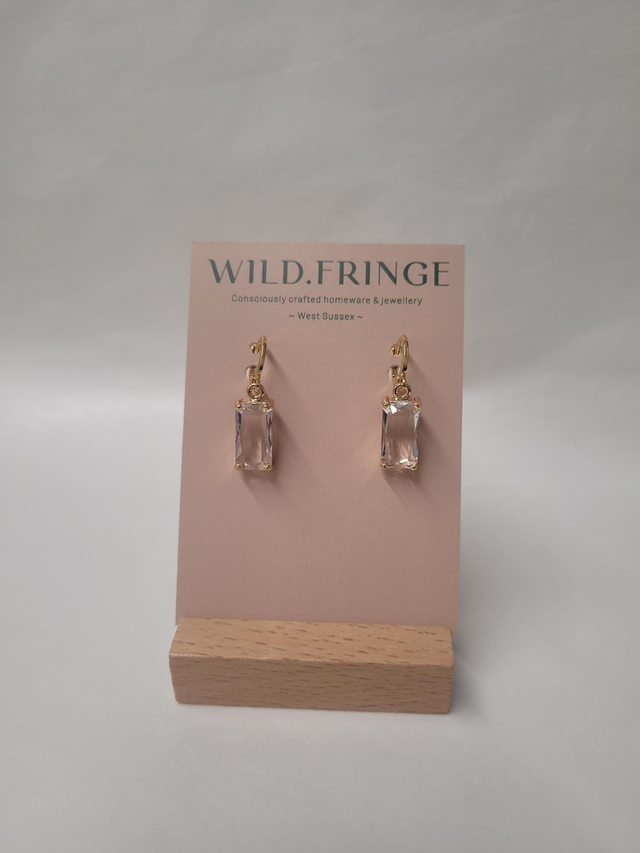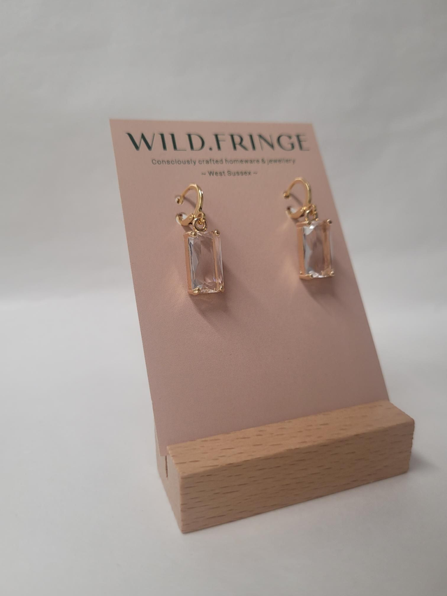 Rectangle cubic zirconia charms attached to 18K real gold plated huggie hoops.