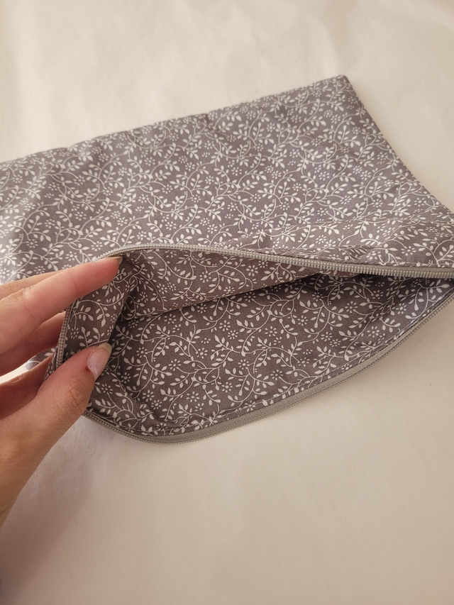 Grey and white floral 100% cotton makeup pouch with zip closure. The pouch is fully lined with 100% grey and white floral cotton to match the outside.