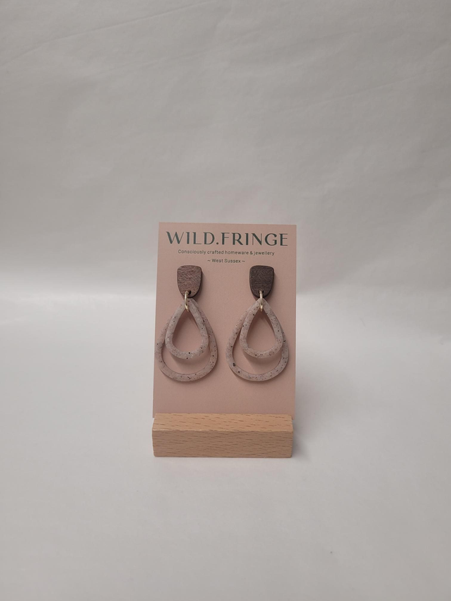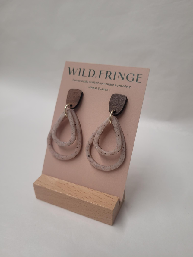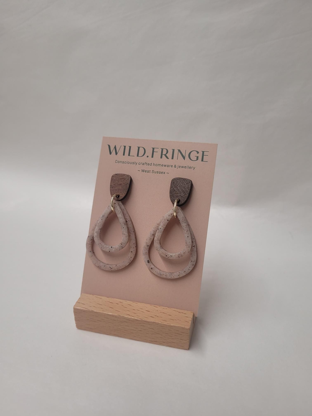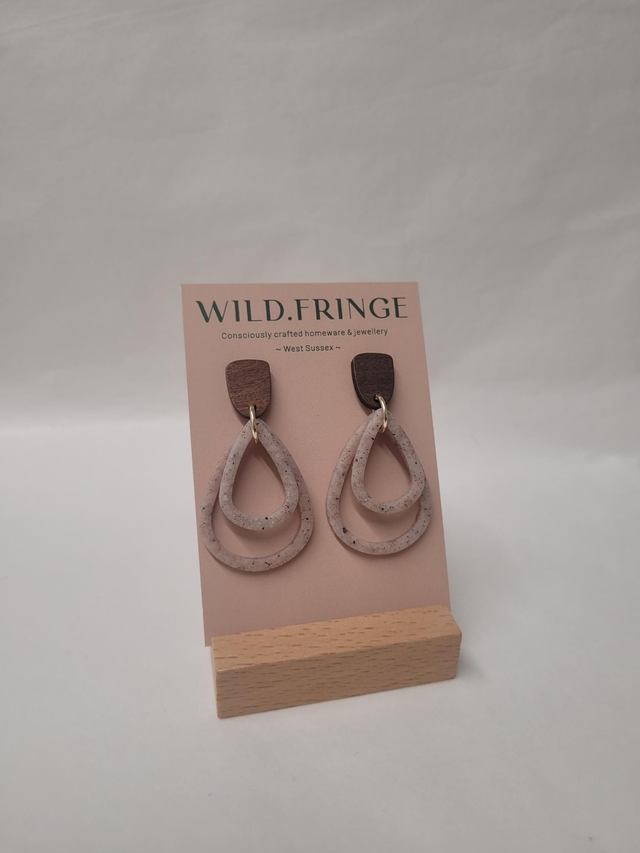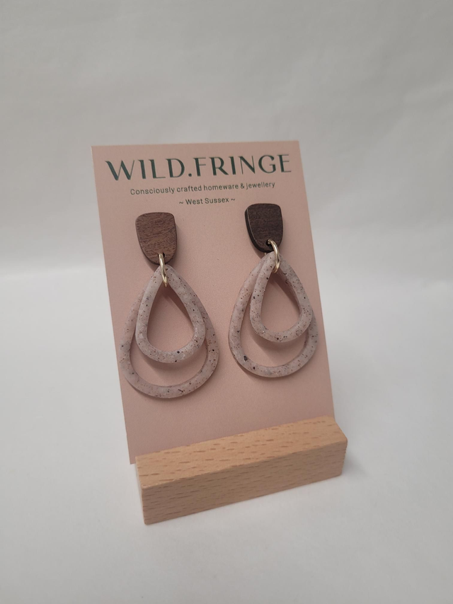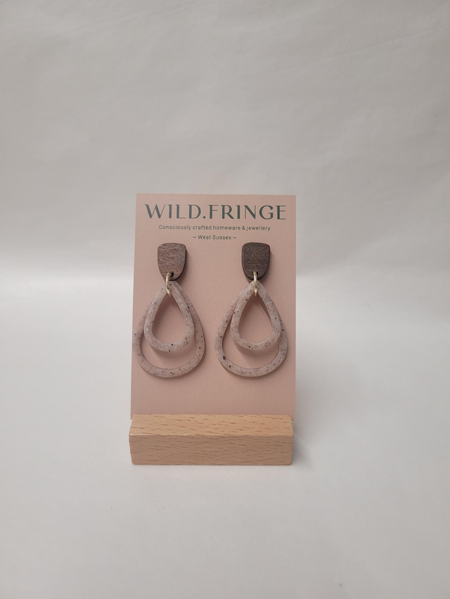 Polymer clay speckled beige double teardrop shaped charm drop earrings. Featuring walnut wooden stud earrings with stainless steel earring posts. Perfect for sensitive ears.