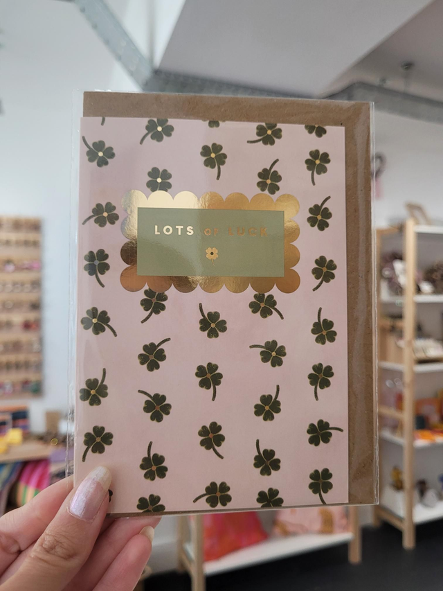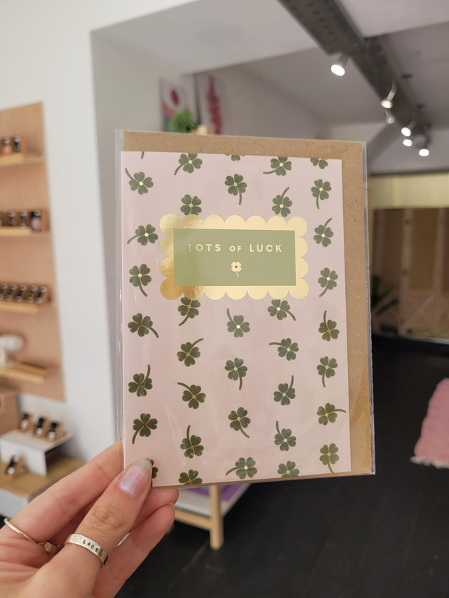 "Lots Of Luck" greetings card with recycled brown Kraft envelope.
