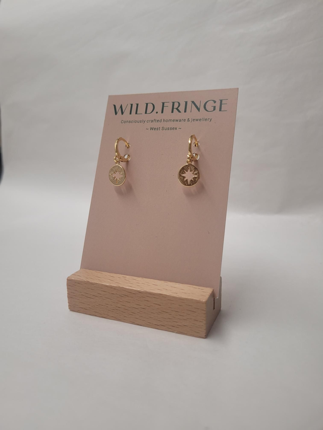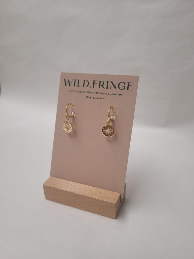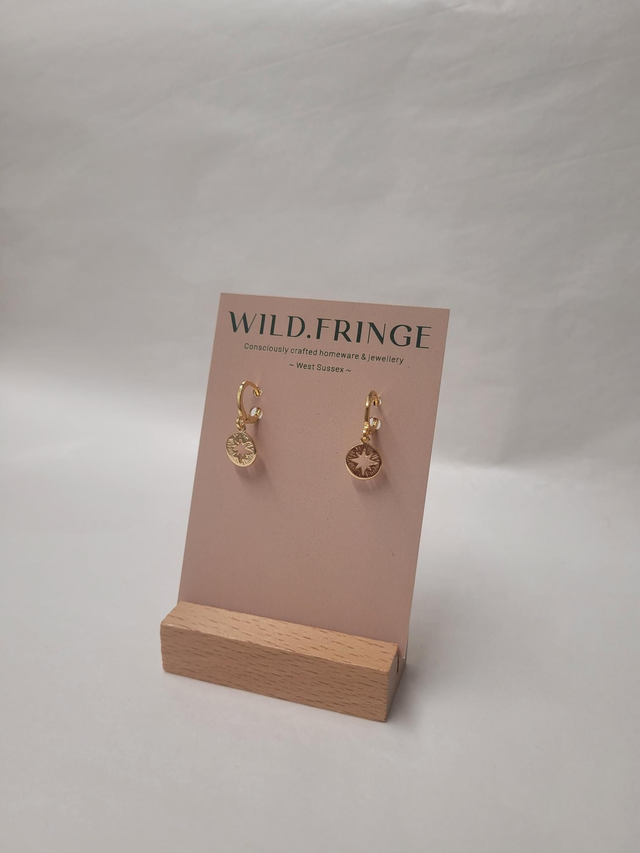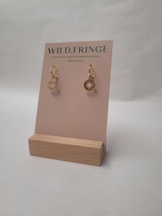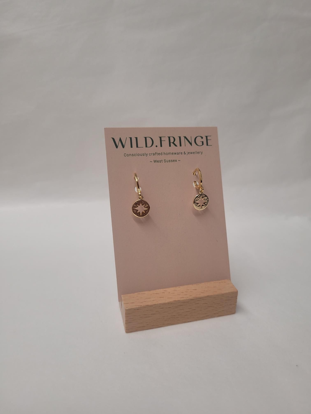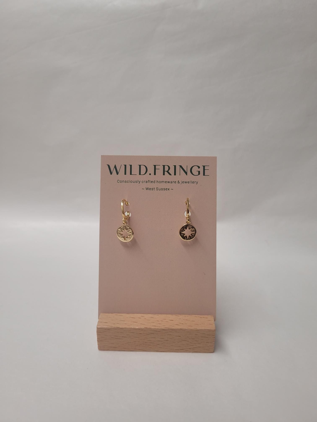 Gold plated circle charms with star cut out centre attached to 18K real gold plated huggie hoops.