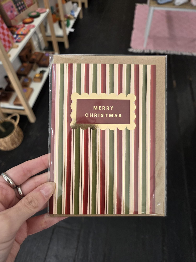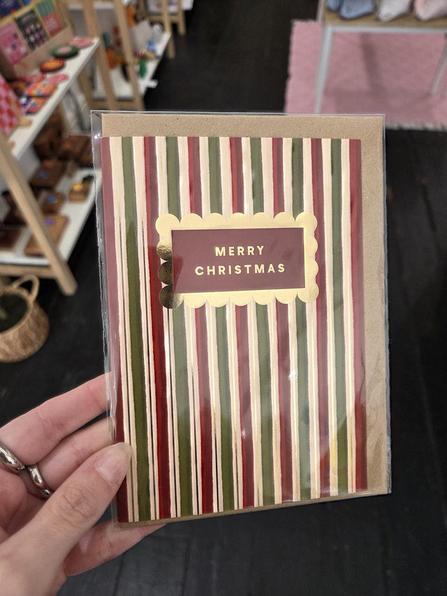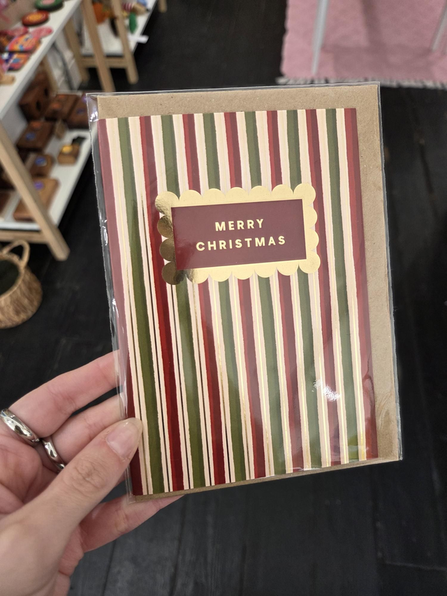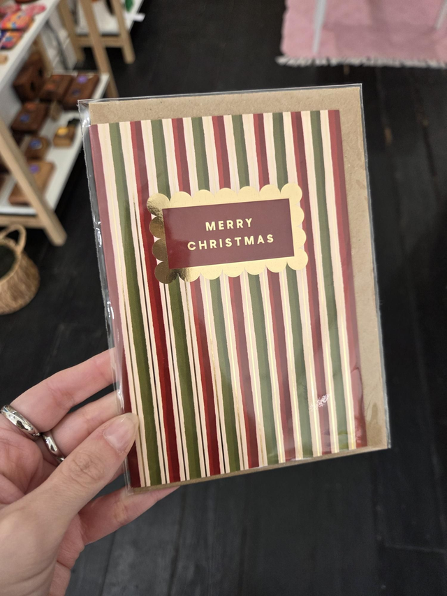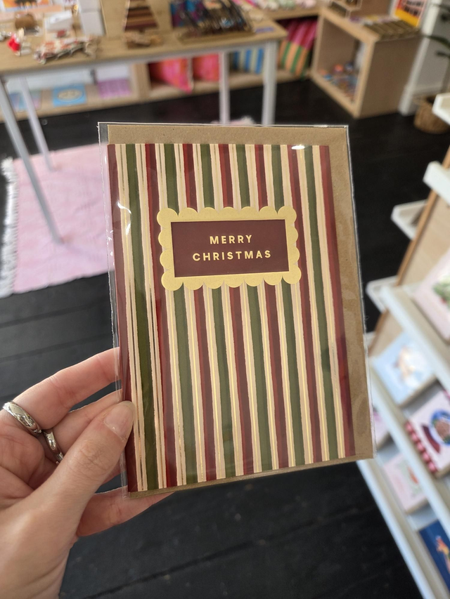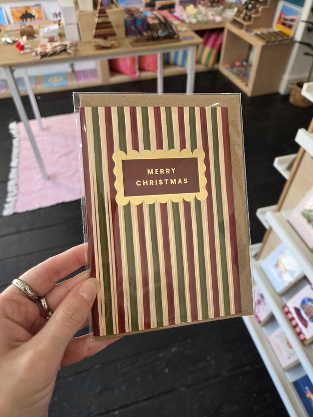 "Merry Christmas" red and green striped Christmas greetings card with recycled brown Kraft envelope.