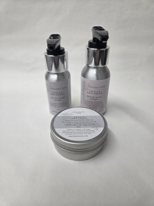 Rejuvenate Body Lotion: How to use: Gently glide the cream over your body and feel the silky hydration. Calming, indulgent skin conditioning. INGREDIENTS: Aqua (Water), Caprylic / capric triglyceride, Vitis vinifera (Grapeseed) Seed Oil, Glyceryl stearate, PEG-100 Stearate, Glyceryl stearate SE, Glycerin (Veg), Cetyl alcohol, Stearic acid, Phenoxyethanol, Ethylhexylglycerin, Squalane, Ficus Carica Fruit Extract, Sodium benzoate, Potassium sorbate, Lavandula angustifolia (Lavender) Flower Oil, Juniperus communis (Juniperberry) Fruit Oil, Tocopheryl acetate (Vitamin E), Limonene, Geraniol, Linalool.