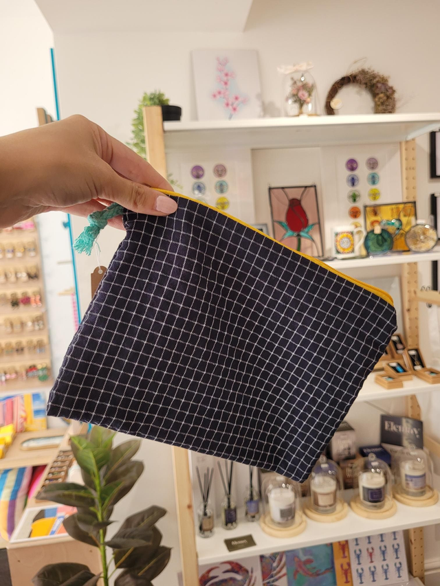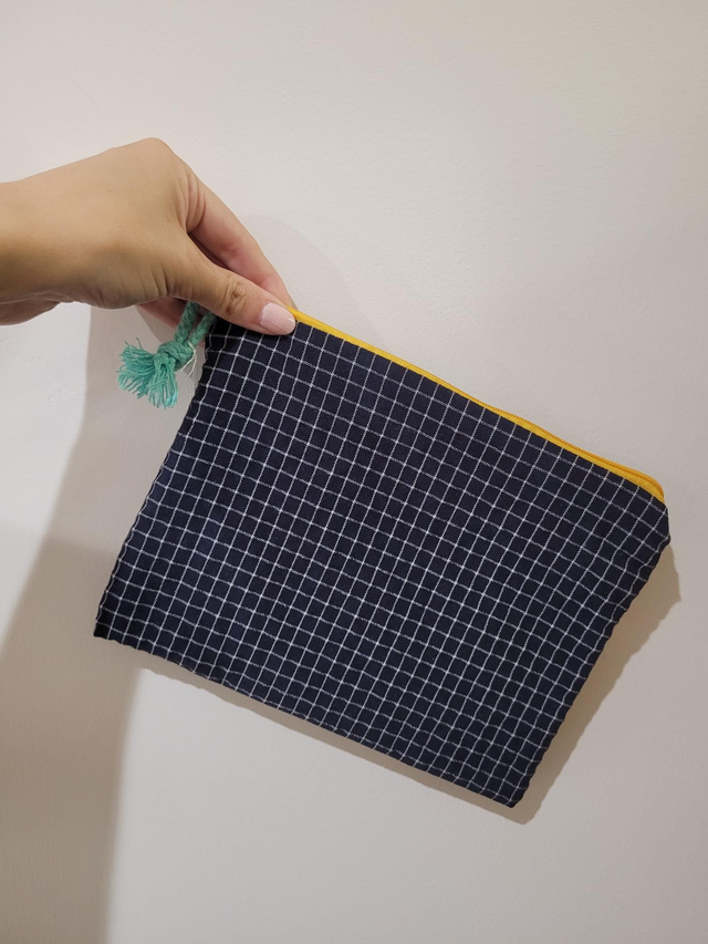 Navy grid pattern makeup pouch with zip closure. The pouch is fully lined.
