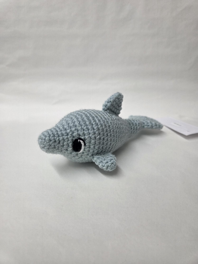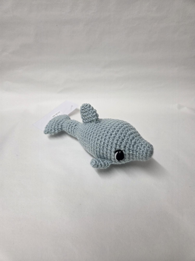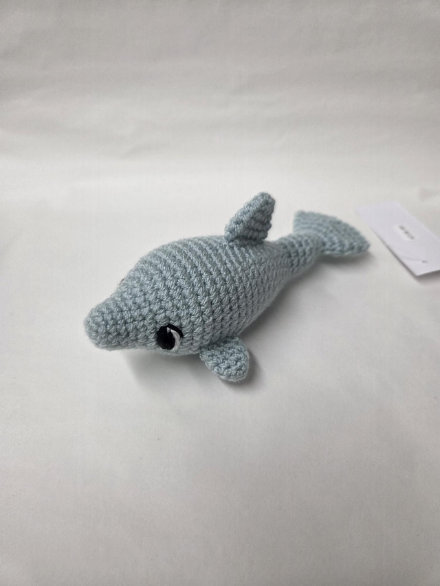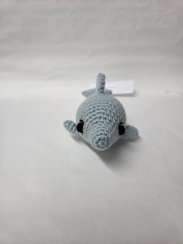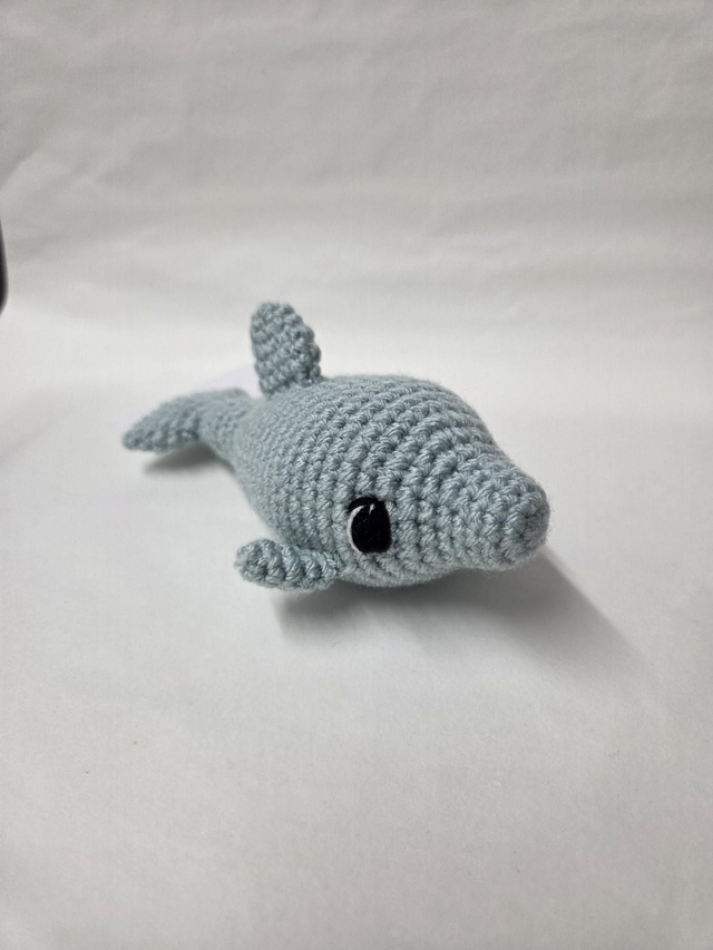 Hand crocheted pale blue dolphin.