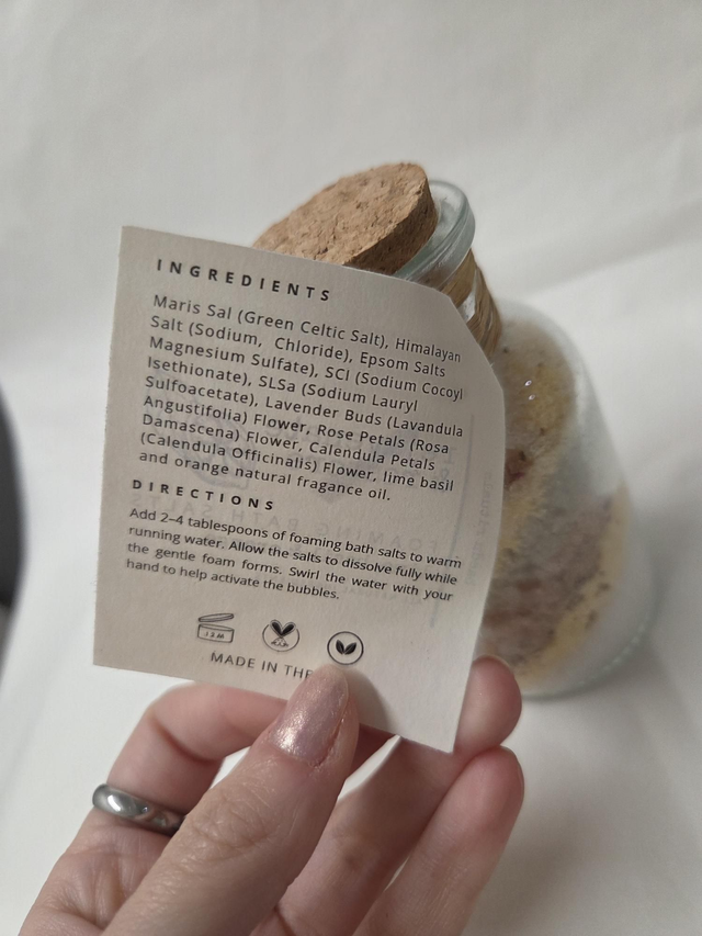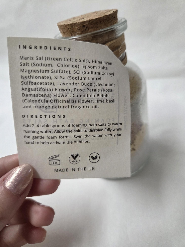 INGREDIENTS: Green Celtic Salt, Himilayan Salt, Epsom Salts, SCI, SLSa, Lavender Buds Flower, Rose Petals Flower, Calendula Petals Flower, Natural Fragrance Oils (Lime, Basil & Orange).