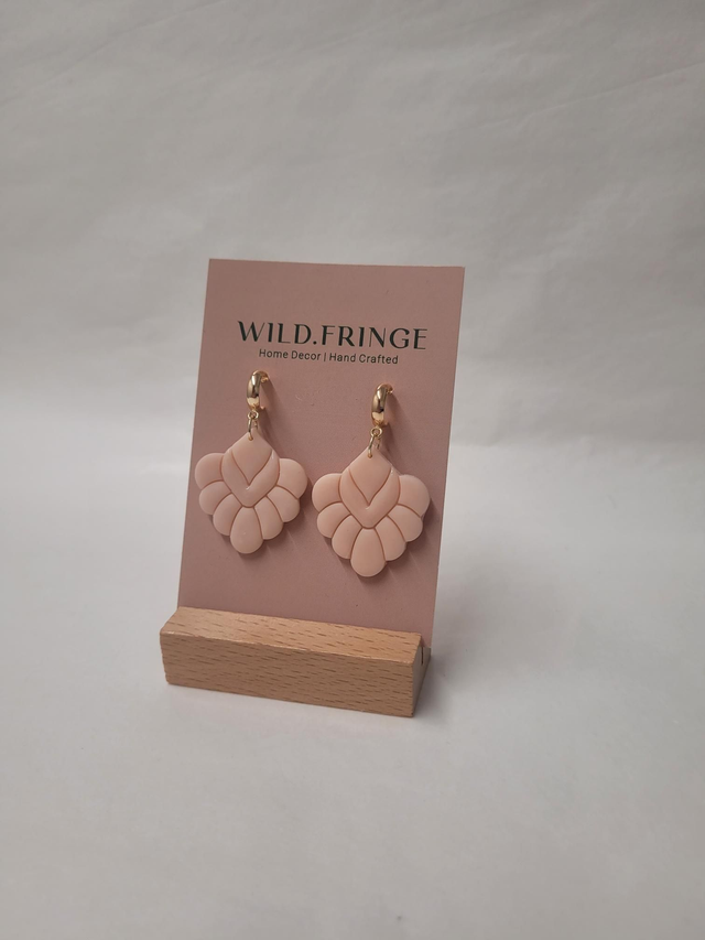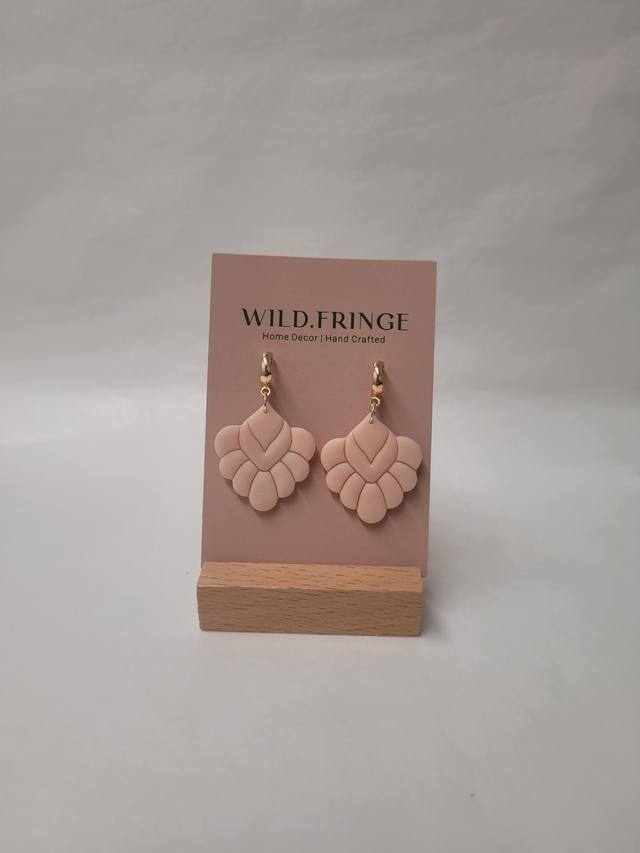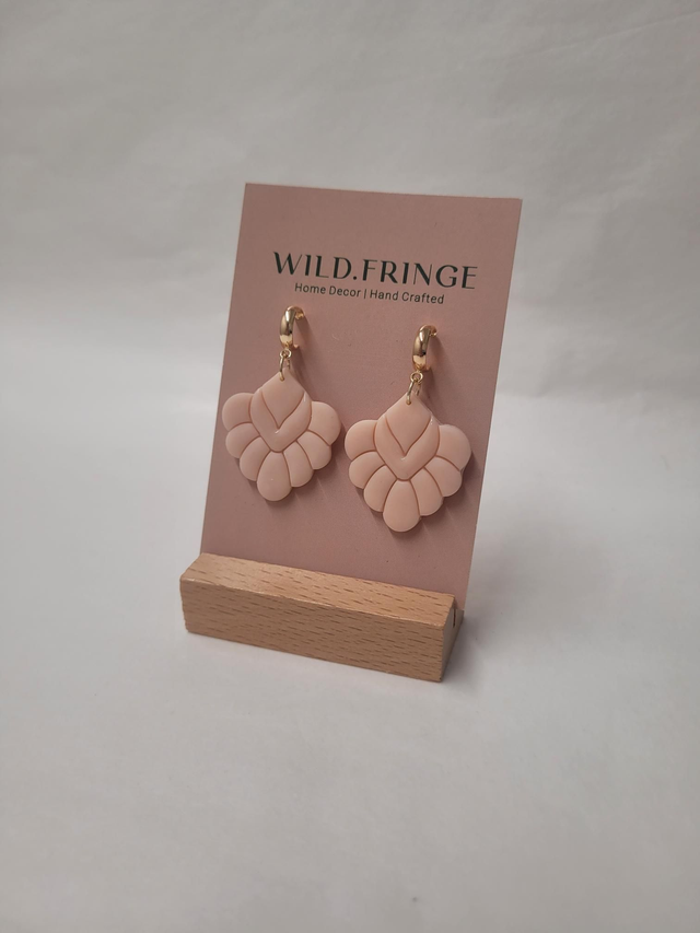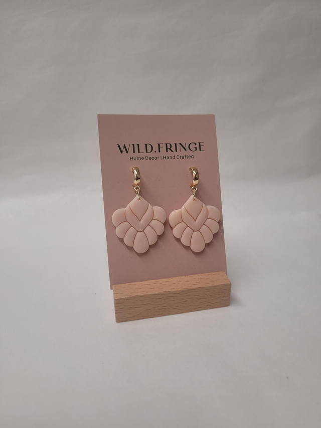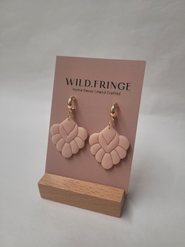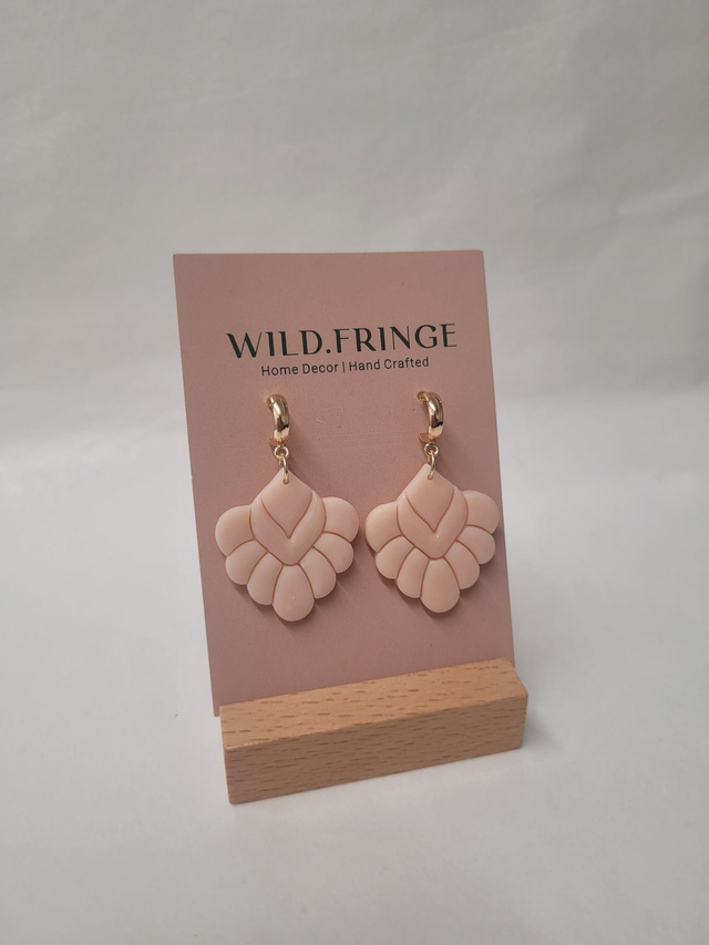 Pale pink polymer clay fan shaped charm drop earrings. Featuring a 18K real gold plate mini hoop stud earring.