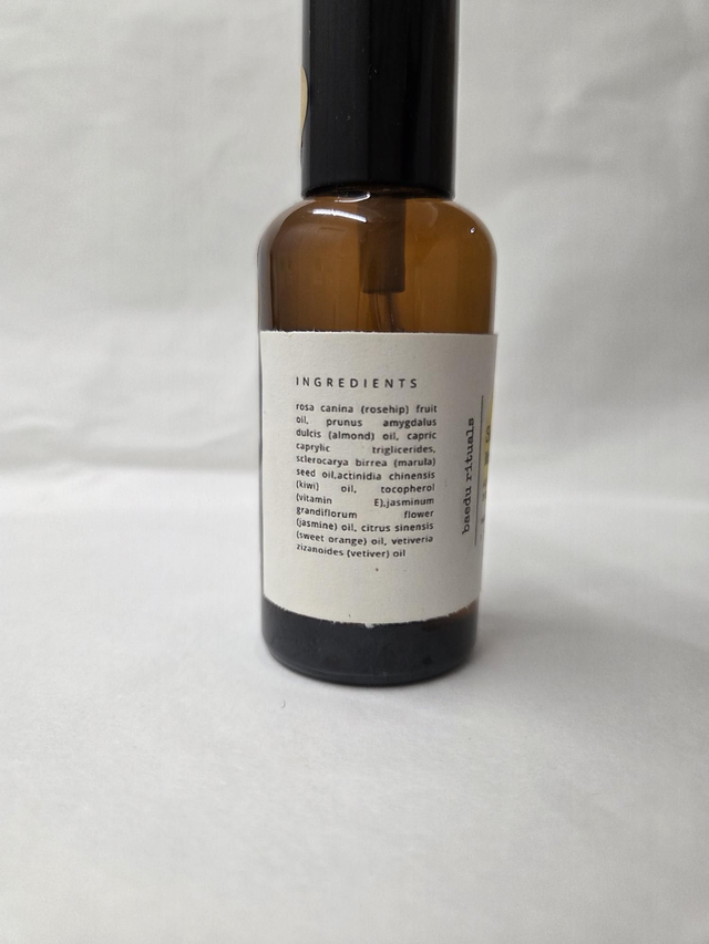 INGREDIENTS: Rosehip oil, almond oil, marula oil, kiwi oil, vitamin e, jasmine flower oil, sweet orange flower oil, vetiver oil.