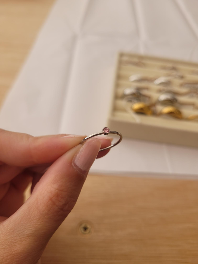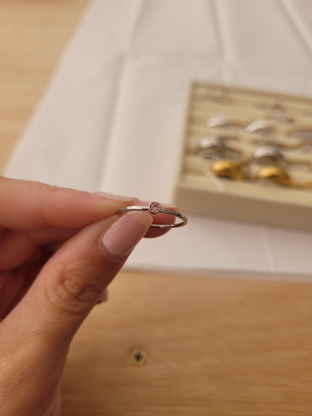 Dainty stainless steel band with cubic zirconia birthstone.