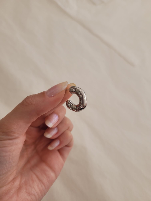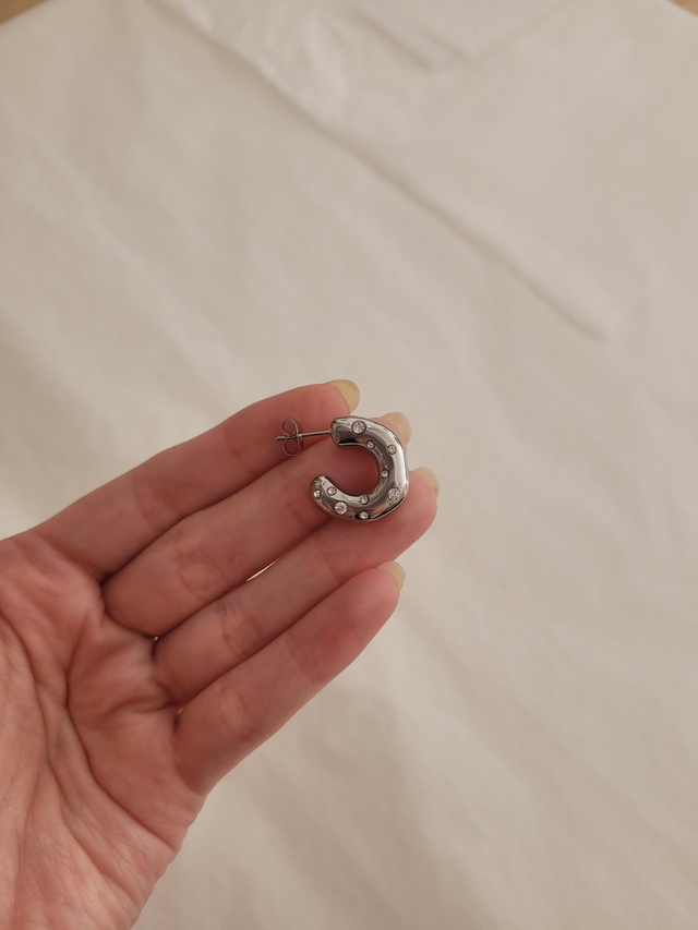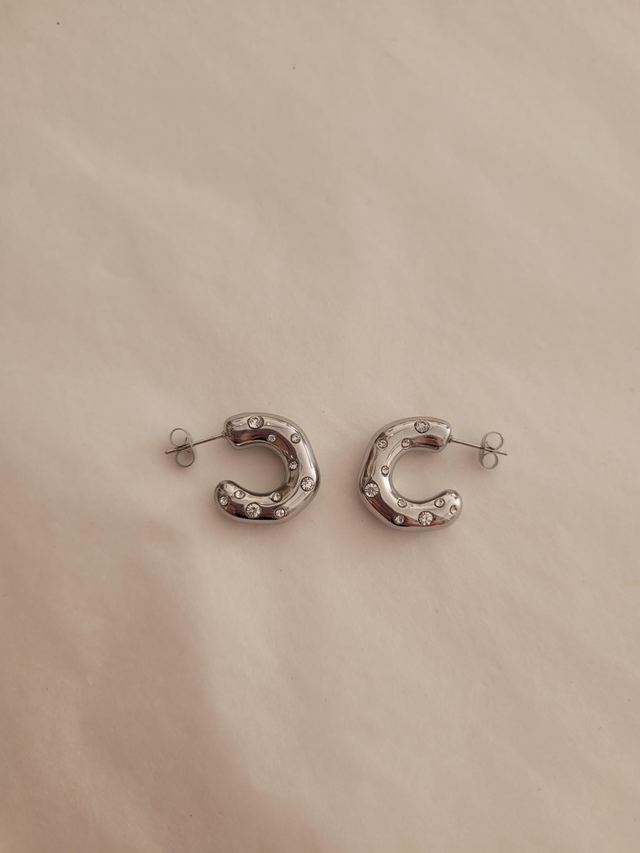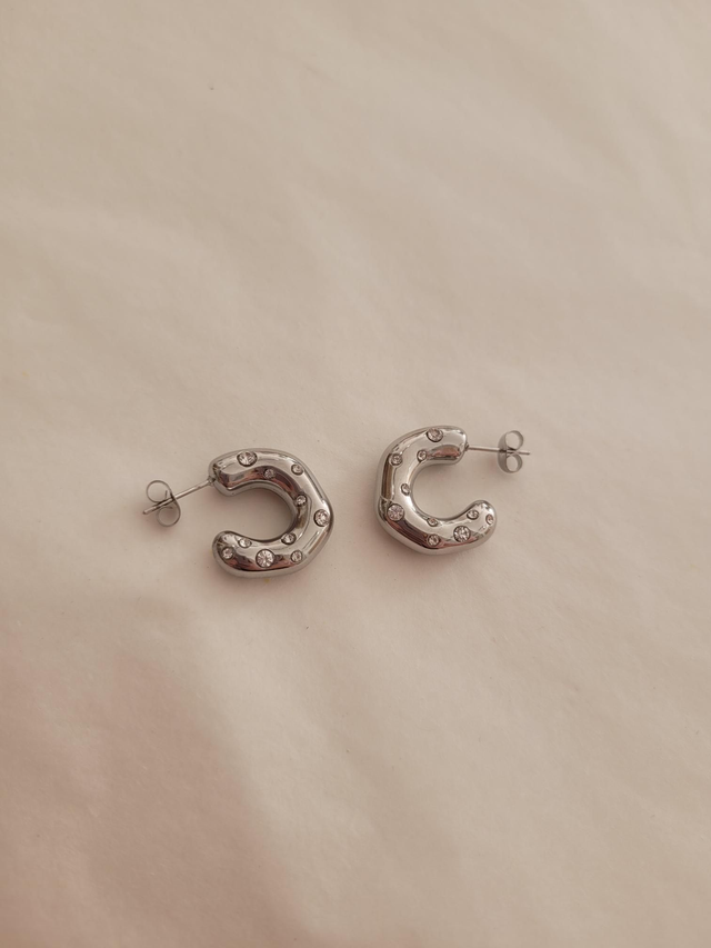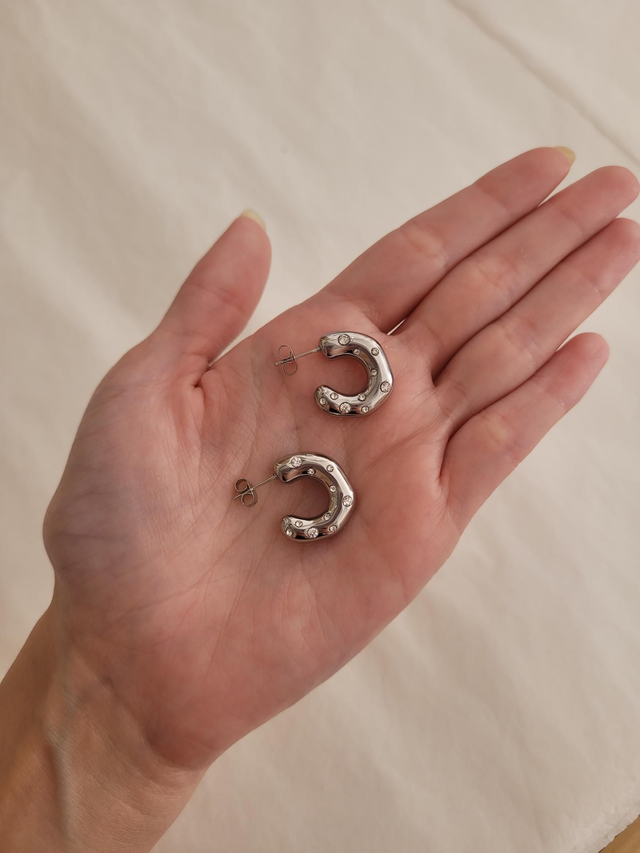 Chunky stainless steel hoop earrings with scattered cubic zirconias throughout. With butterfly backs.