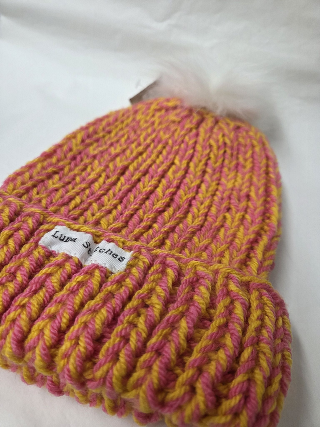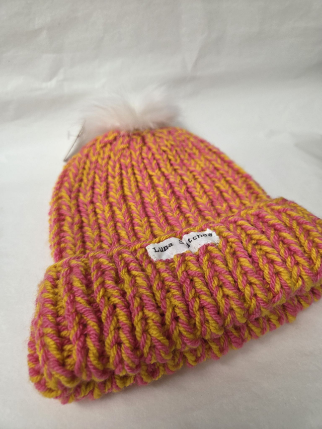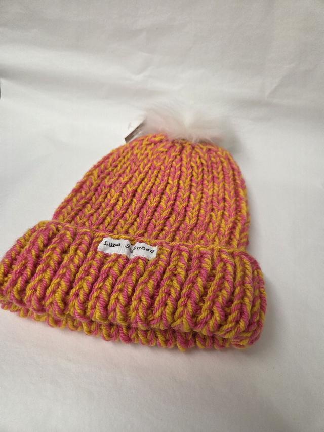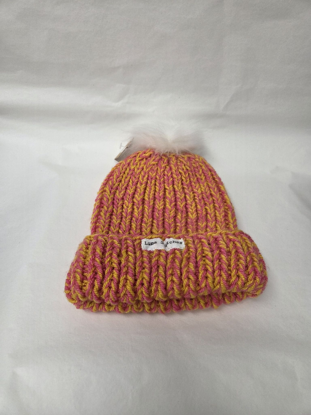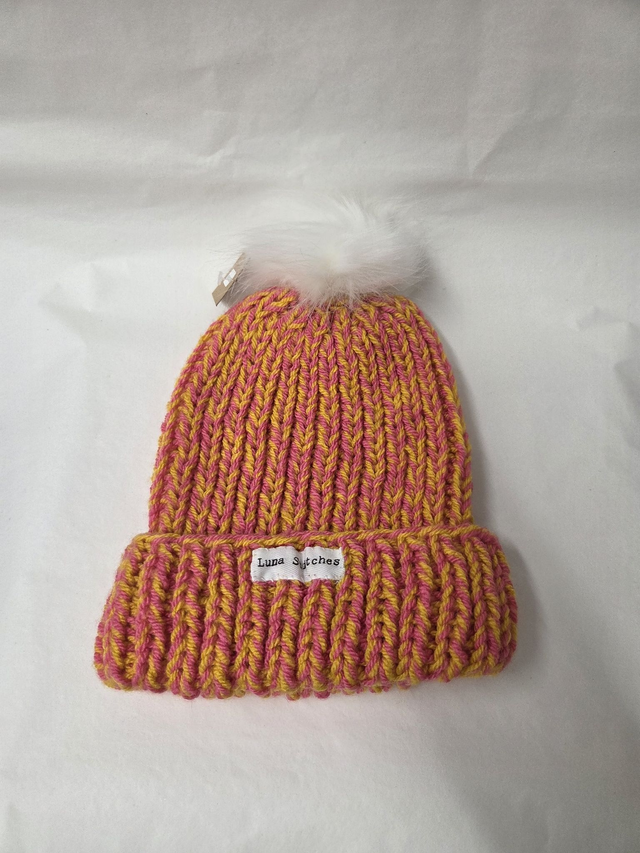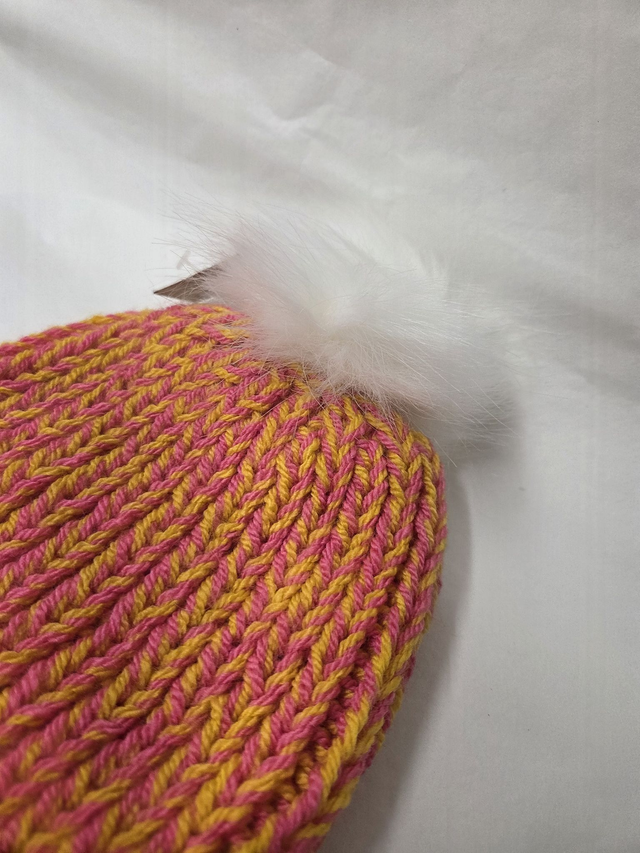 Yellow and Pink knitted hat with fluffy bobble hat.