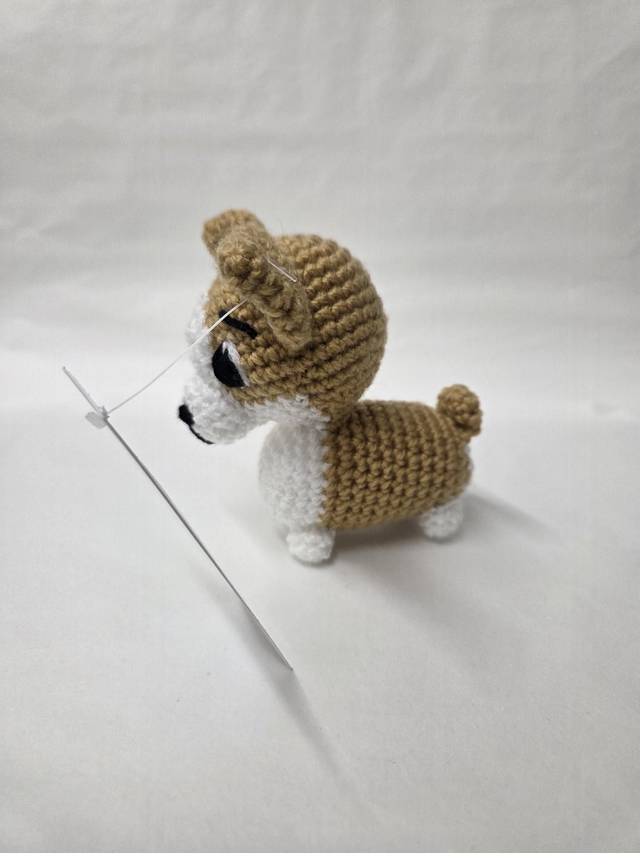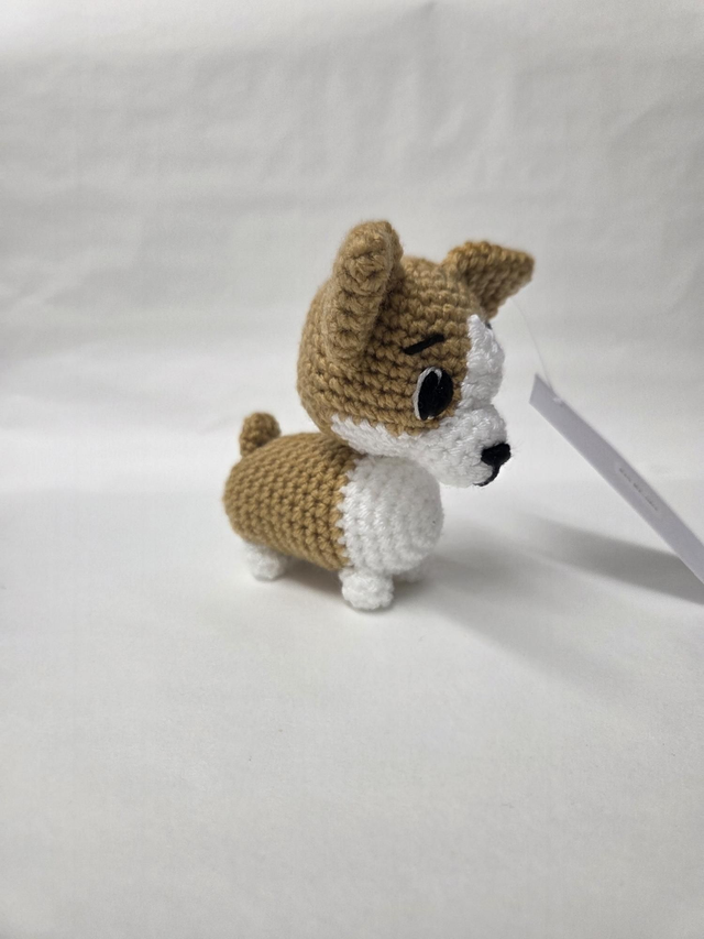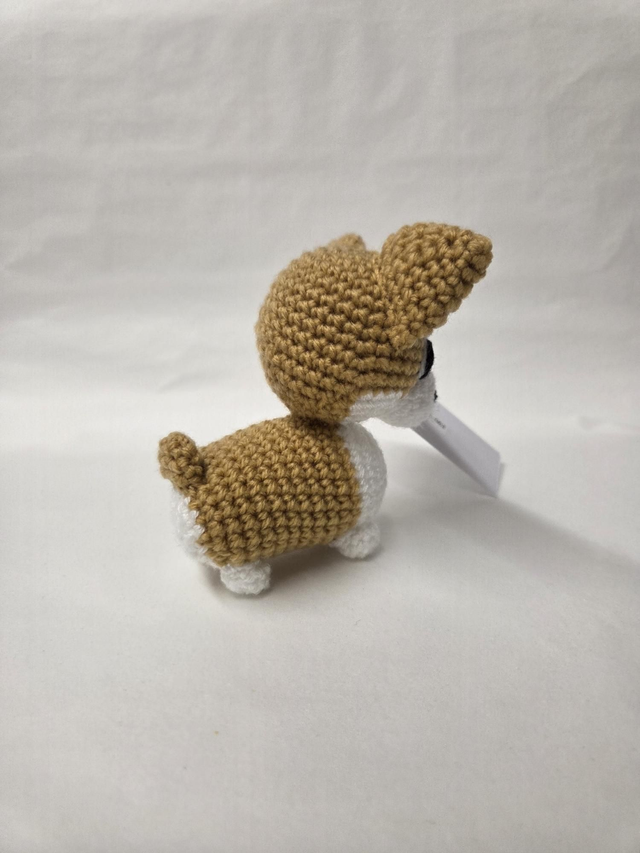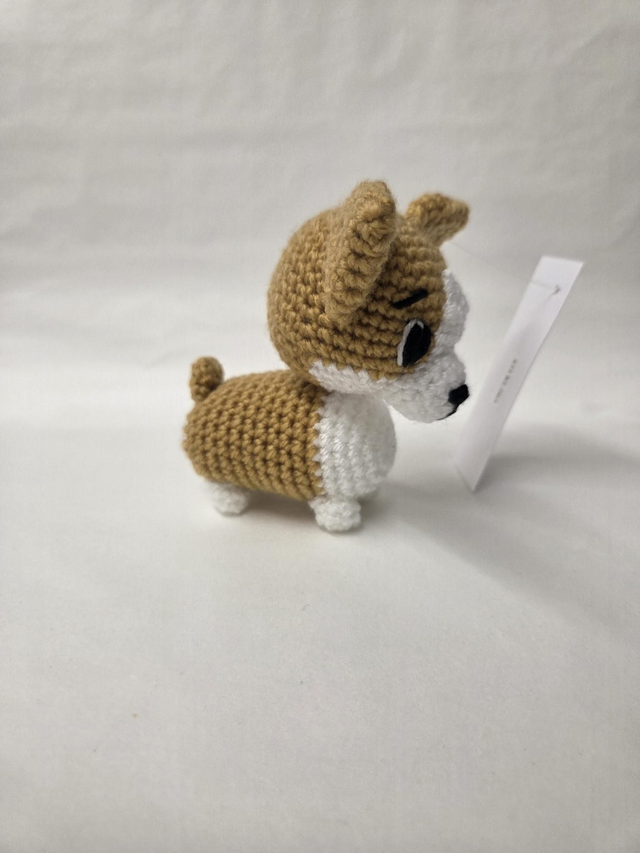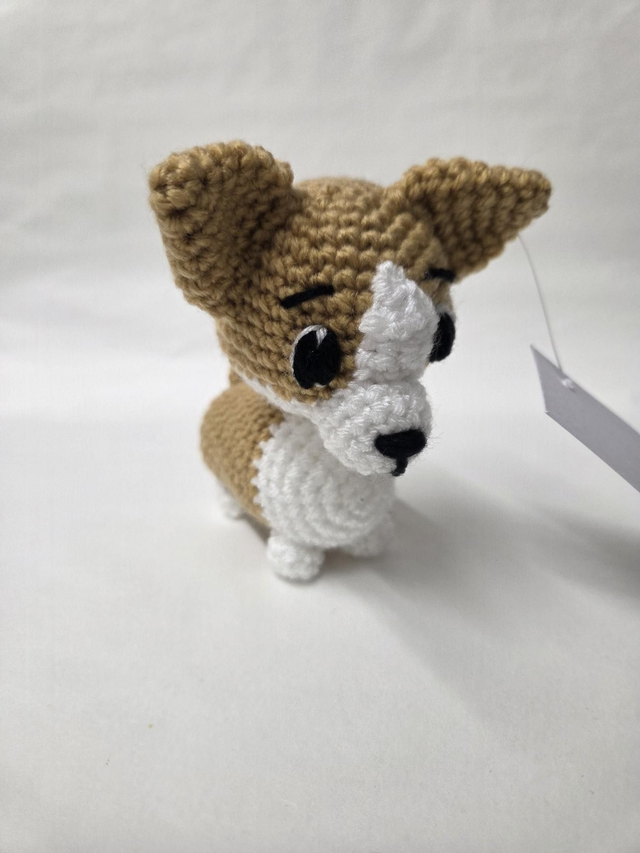 Hand crocheted tan and white corgi dog.